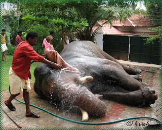 (നാട്ടിലെ ഉത്സവദിവസം രാവിലെ, ദേവിയുടെ തിടമ്പ് ഏറ്റാനുള്ള ഗജരാജനെ കുളിപ്പിക്കാന് അടുത്തൊരു വീട്ടില് കൊണ്ടുവന്നപ്പോള് എടുത്ത ചിത്രങ്ങള്. ഉത്സവമെല്ലാം കഴിഞ്ഞ് അടുത്ത ദിവസം, വേറൊരു ഉത്സവസ്ഥലത്തേക്ക് കൊണ്ടുപോകാനായി ലോറിയില് കയറ്റുമ്പോള് ഇവന് ചെറുതായൊന്ന് ഇടയുകയും ലോറിയെ കുലുക്കുകയും വേറെ ആനയെ ചെറുതായൊന്നു മുട്ടി വിരട്ടുകയും ചെയ്തു. ഈ സമയത്ത് ഇവന്റെ ചിന്നം വിളി വീട്ടിലിരുന്ന് ഞാന് കേട്ടുവെങ്കിലും അതത്ര കാര്യമാക്കിയില്ല. പിന്നീടാണ് അറിഞ്ഞത് ഇവനുണ്ടാക്കിയ പൊല്ലാപ്പുകള്. എന്നാല് നിമിഷങ്ങള്ക്കകം പാപ്പാന് ആനയെ ശാന്തനാക്കി ലോറിയില് കയറ്റി കൊണ്ടുപോവുകയും ചെയ്തു)